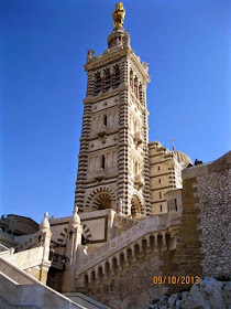 De aici avem o frumoasă vedere panoramică a portului vechi. Urcăm cu microbuzul pe dealul din sudul portului vechi, să vizităm enorma bazilică catolică Notre Dame de la Garde, ridicată în sec. 19 de către arhitectul Esperandieu.